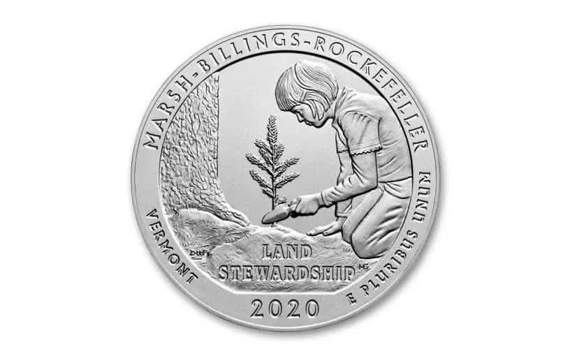- STUNNING NATURAL SCENERY – The design features a young girl planting a Norway spruce seedling. It also displays the words “LAND STEWARDSHIP,” “MARSH-BILLINGS-ROCKEFELLER,” “VERMONT,” “2020” and “E PLURIBUS UNUM.”